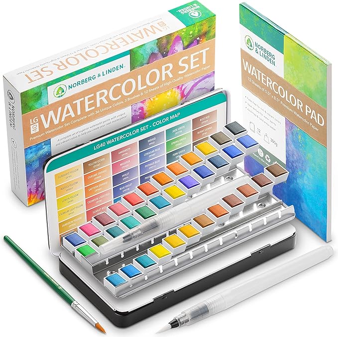 Amazon Com Norberg Linden Lg Watercolor Paint Set 36 Colors In Half Pans 12 Sheet Paper Pad 2 Refillable Water Brushes And An Artist Painting Brush Vibrant Water Soluble Pigments In